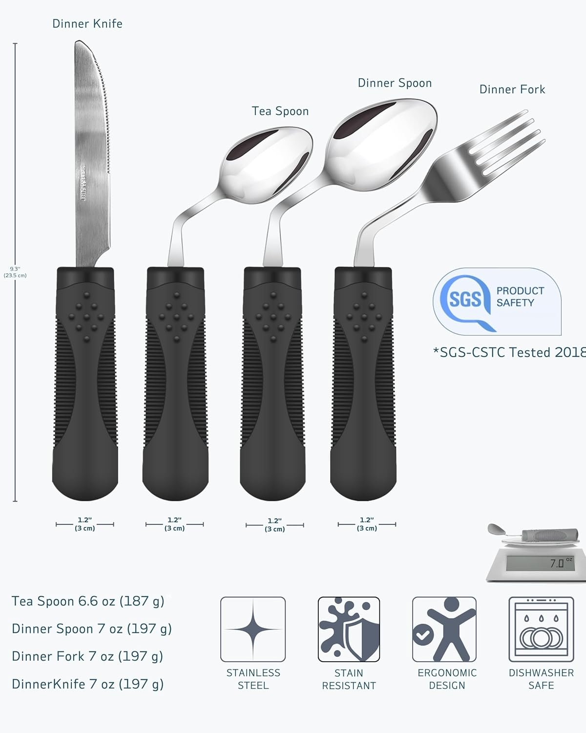 OPTIMIZED 7 oz WEIGHTED UTENSILS: Each utensil weighs 7 oz, providing ideal stability for hand tremors without causing excessive fatigue. Perfectly balanced to enhance control and ease during meals.