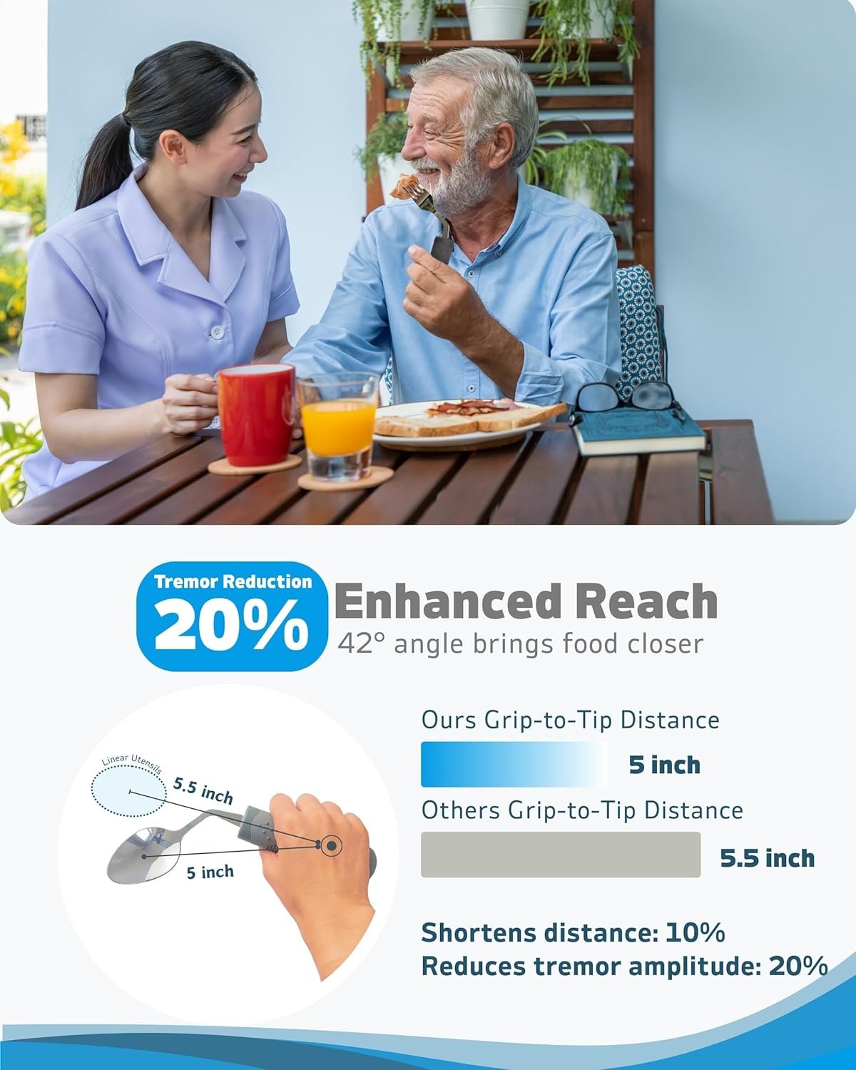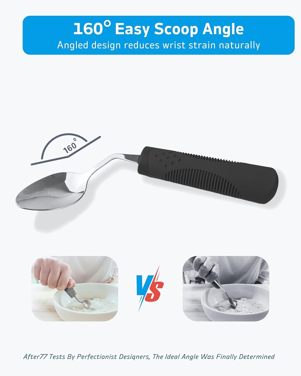ERGONOMIC 42° ANGLED DESIGN: Specifically designed for Parkinson’s patients, elderly, arthritis sufferers, and those with hand tremors. The angled design reduces wrist rotation and fatigue, enabling more comfortable and independent eating.