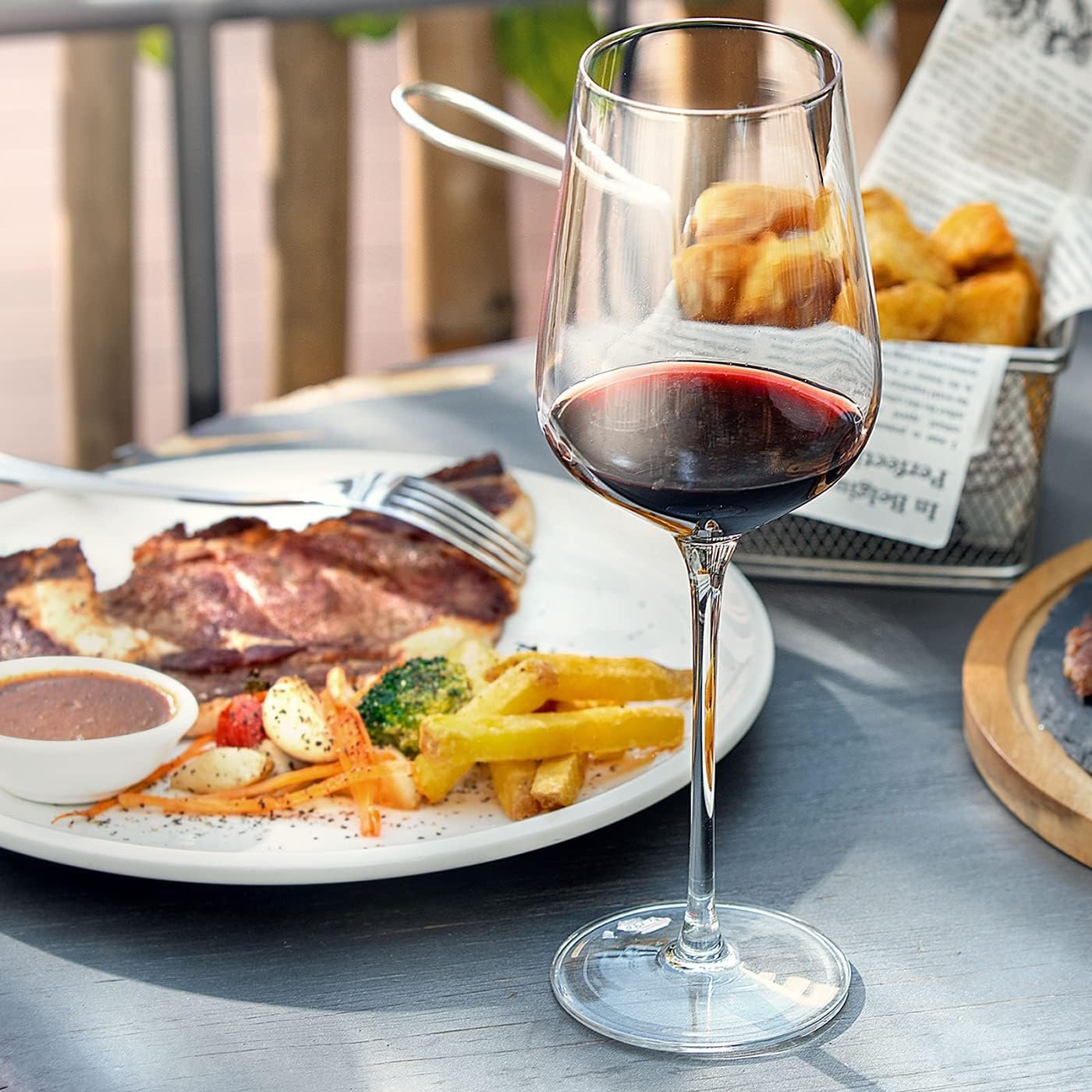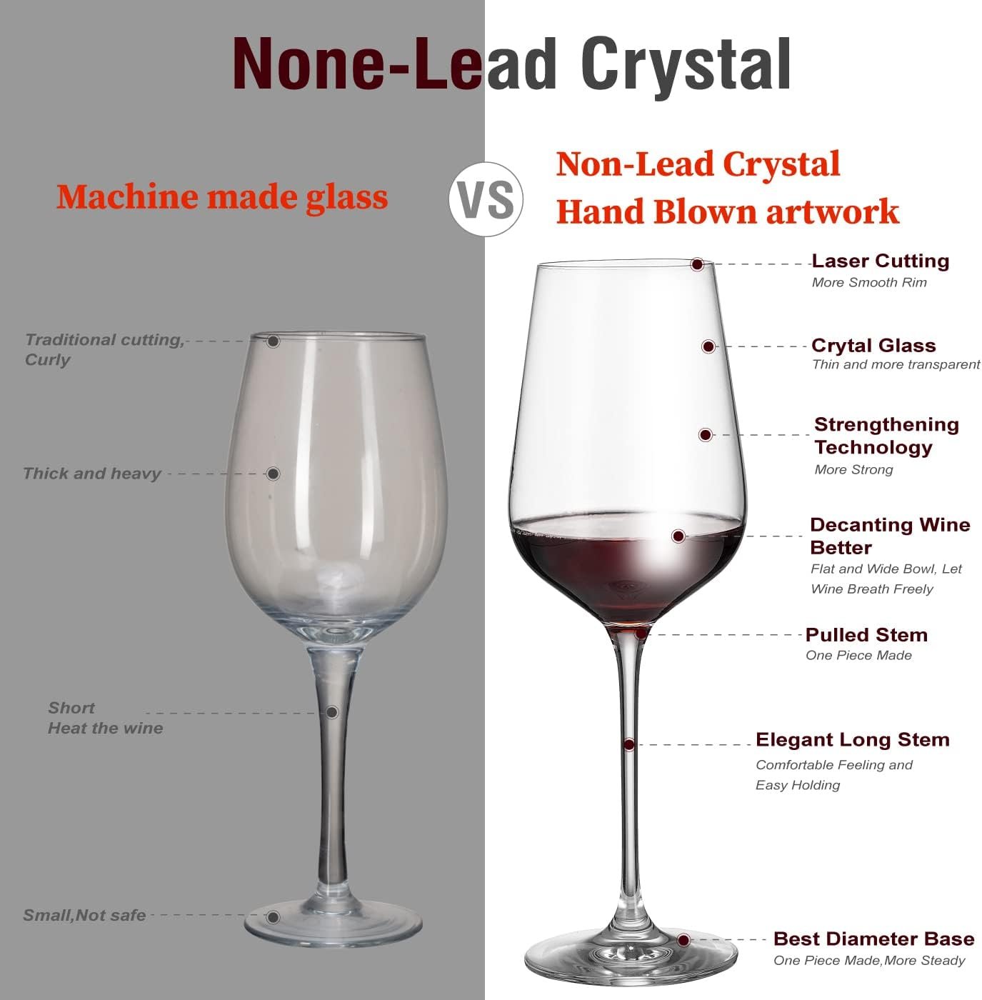 Lead Free Premium Crystal Blown Glass- These classic and long-stemmed wine glasses are integrally formed,and laser cold cutting process technology are used for the glass mouth,the ultra-thin and smooth rim allows wine to enter the mouth smoothly,Crytal glass material is very thin and much more transparent that greatly enhanced the tasting and visual feast of any kind of red wine.