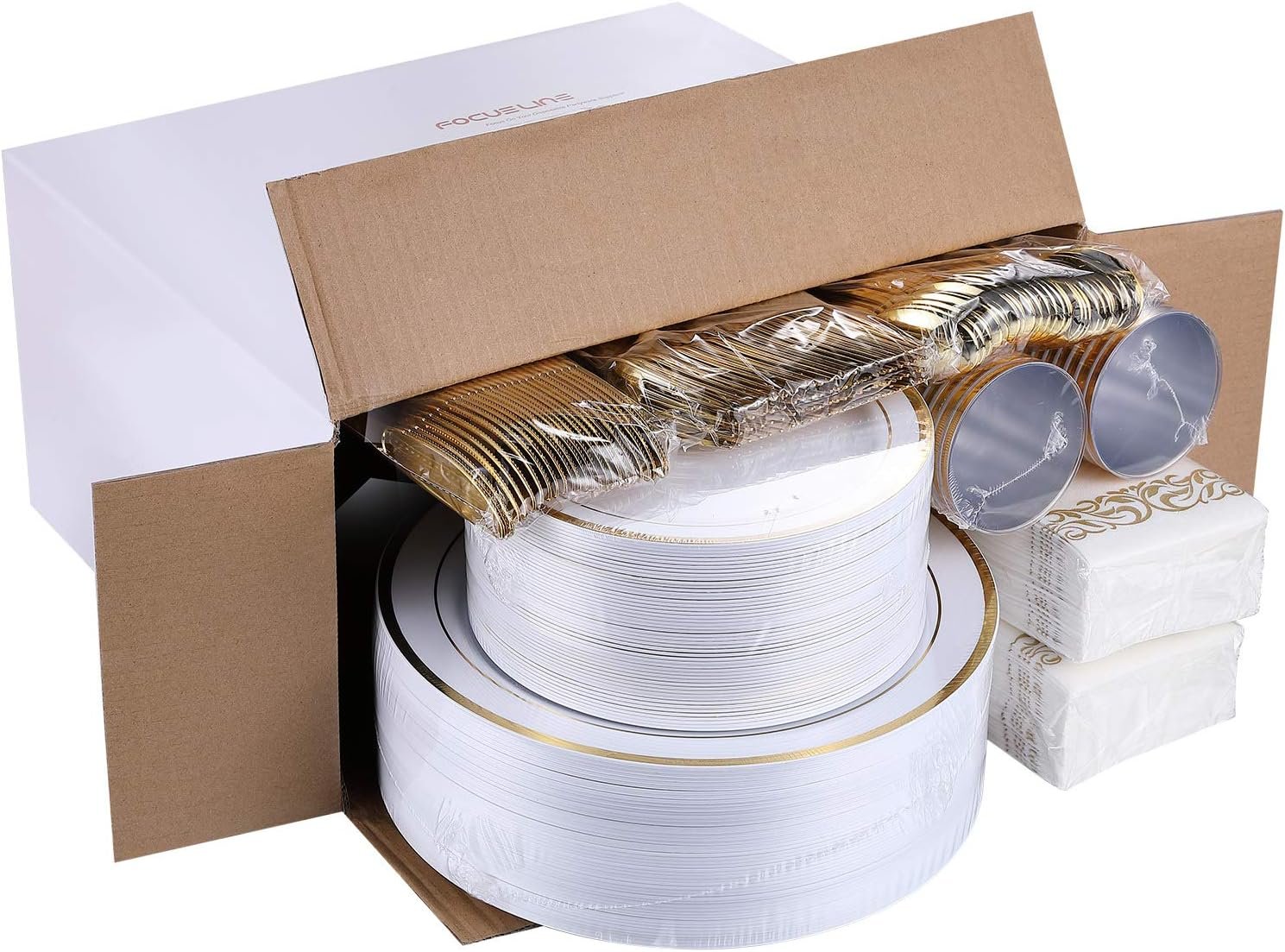 Be the first to review “FOCUSLINE 350 Ct Disposable Dinnerware Set for 50 Guests -Heavy Duty Plastic Plates with Gold Rim, Includes 50 Dinner & Salad Plates, Cups, Napkins, Cutlery Set”