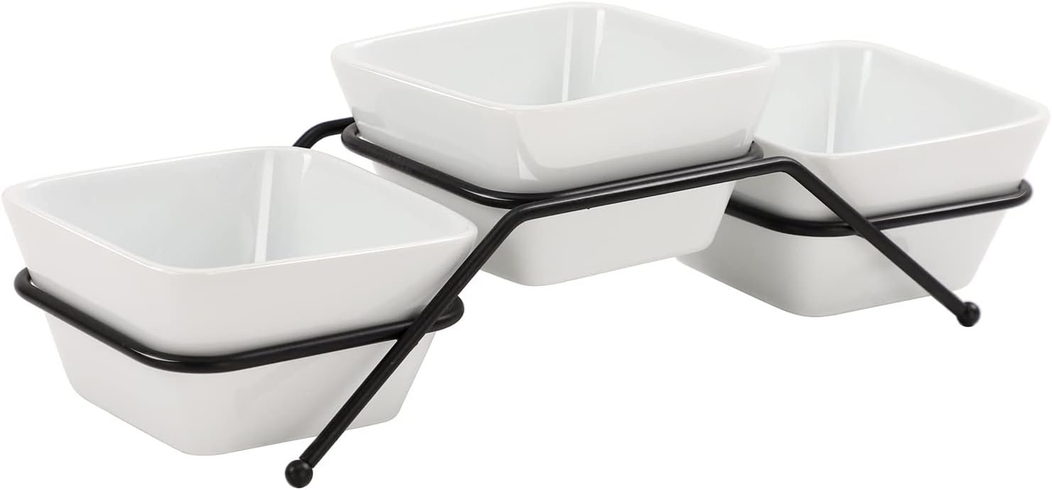 3 pcs square bowl Porcelain Chip & Dip Serving Set with Black Metal Stand, 4.5inch White Small Serving Bowls for Side Dishes, Salsa, Appetizer, Serving Dishes for Entertaining 11.5 OZ