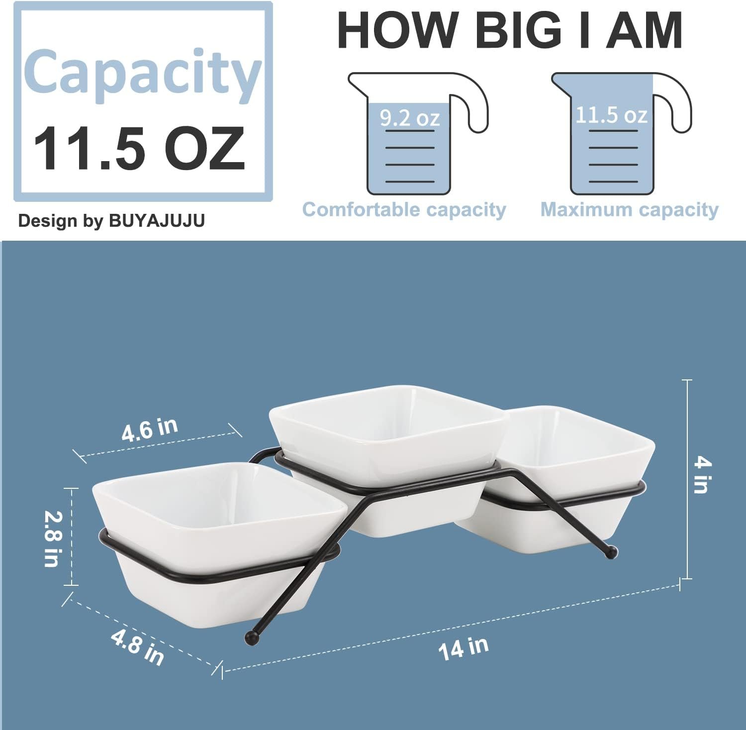 【Approximate Dimensions】13.6″’L * 4.7″W * 3.0″H; Each Ceramic Bowl – 4.5″L * 4.5″W * 2.5″H (in inches).