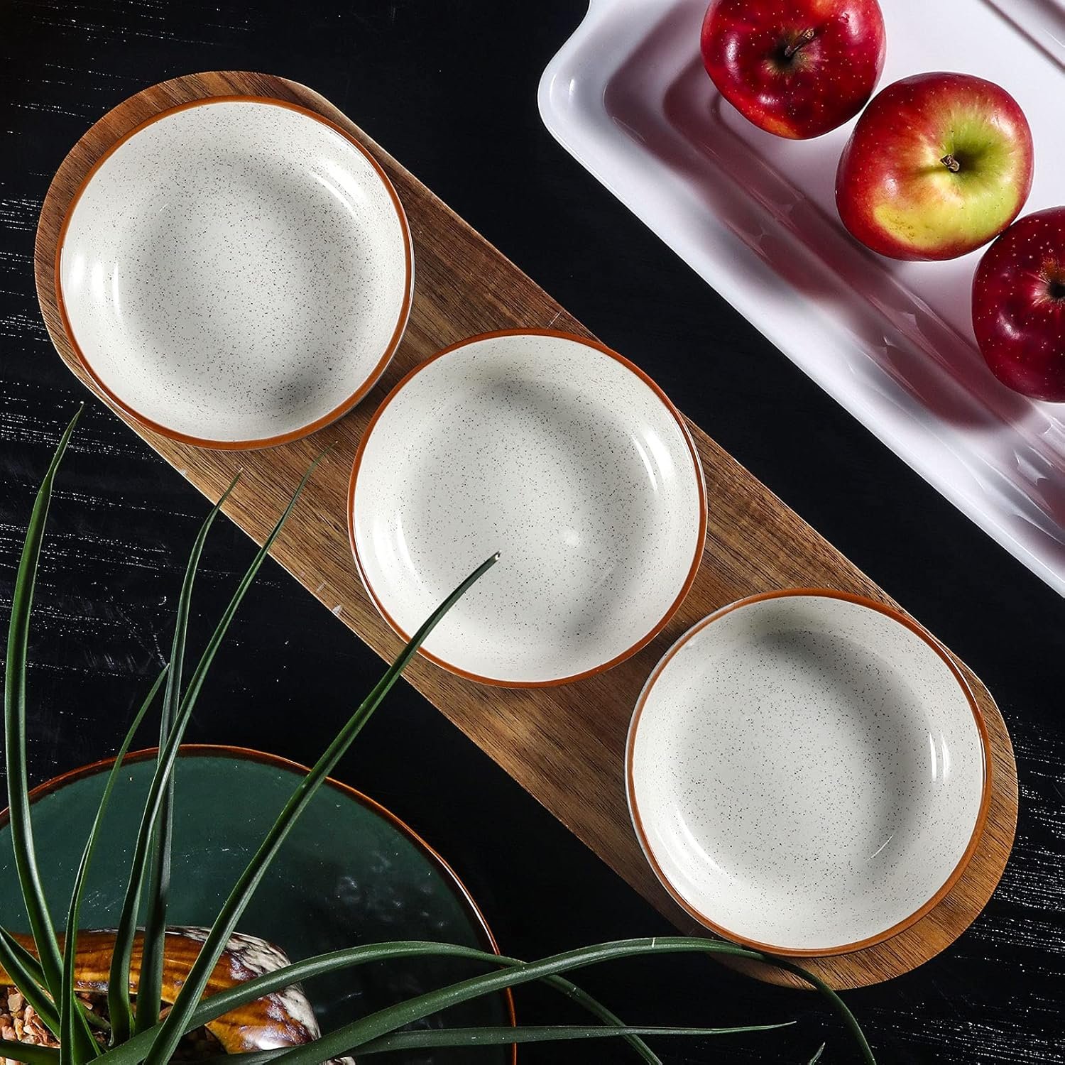 【Practicality】The solid wood platter, a beautiful counterpoint to the sleek glazing ceramic, nestles the salsa bowls, protects tables and counter tops from the hot dishes and makes for easy passing. Due to its handcrafted nature, each small serving dish will be slightly unique.