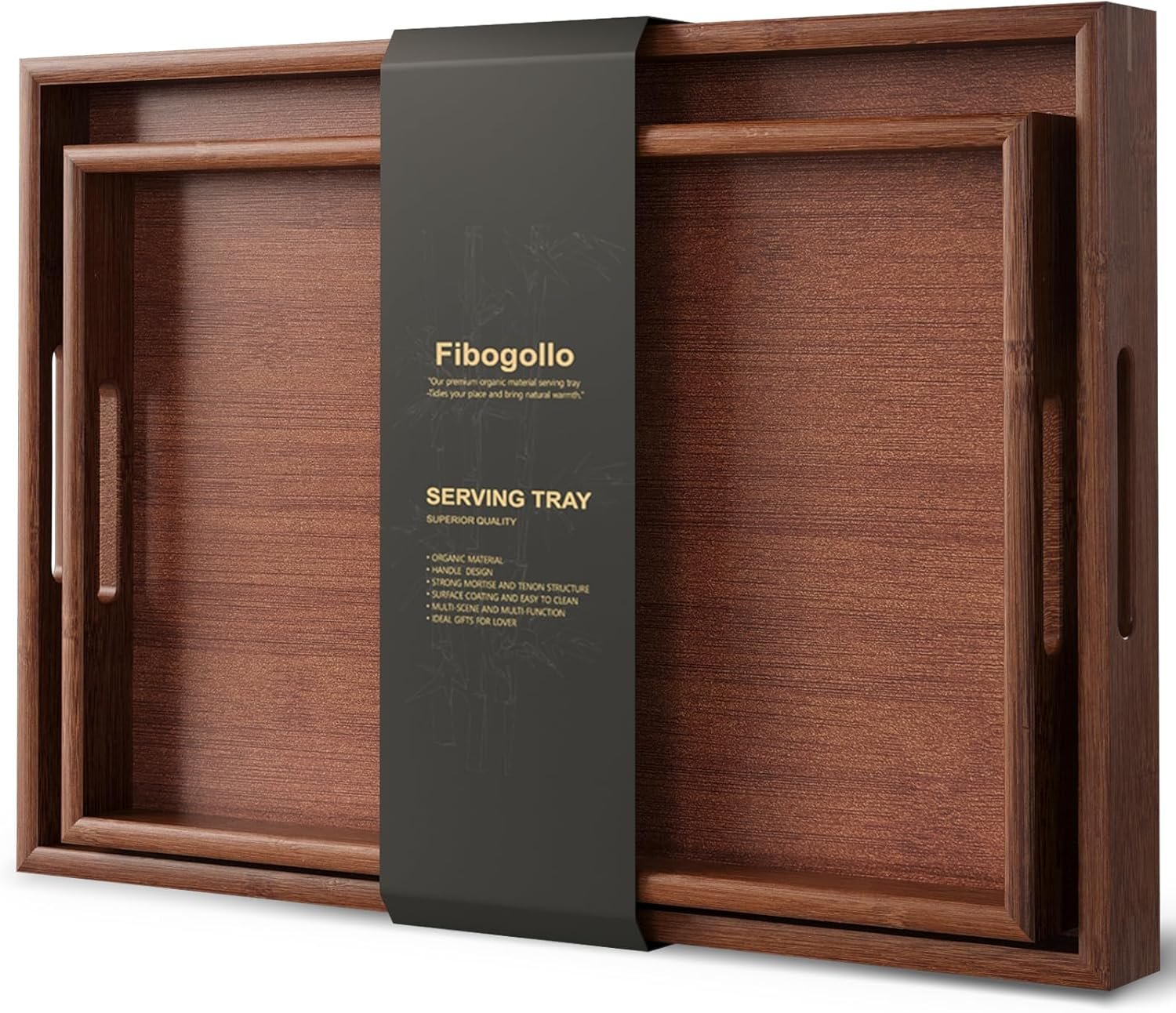 Bamboo Set of 2 Serving Tray with Handles,Decorative Trays Platter,Breakfast Tray in Bed,Food Drinks Tray for Eating,Working,Storing(Brown)