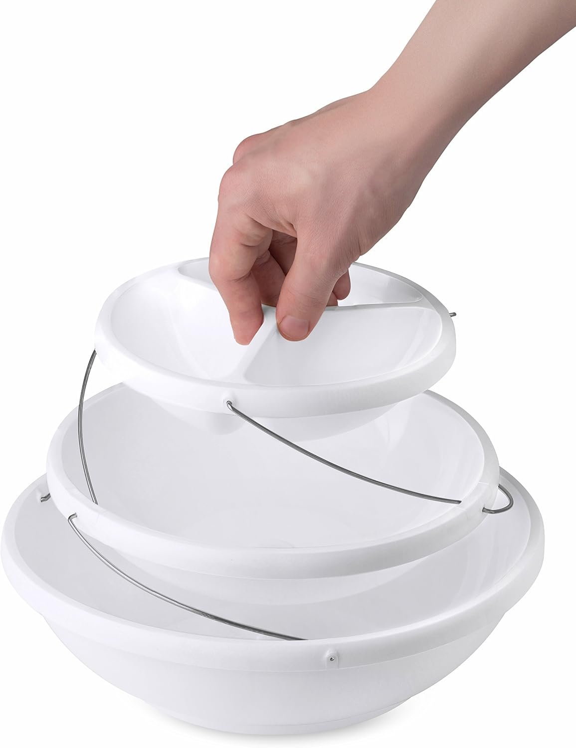 REQUIRES MINIMAL STORAGE SPACE: The patented plastic bowls twist down and nest in one another making it easy to store.