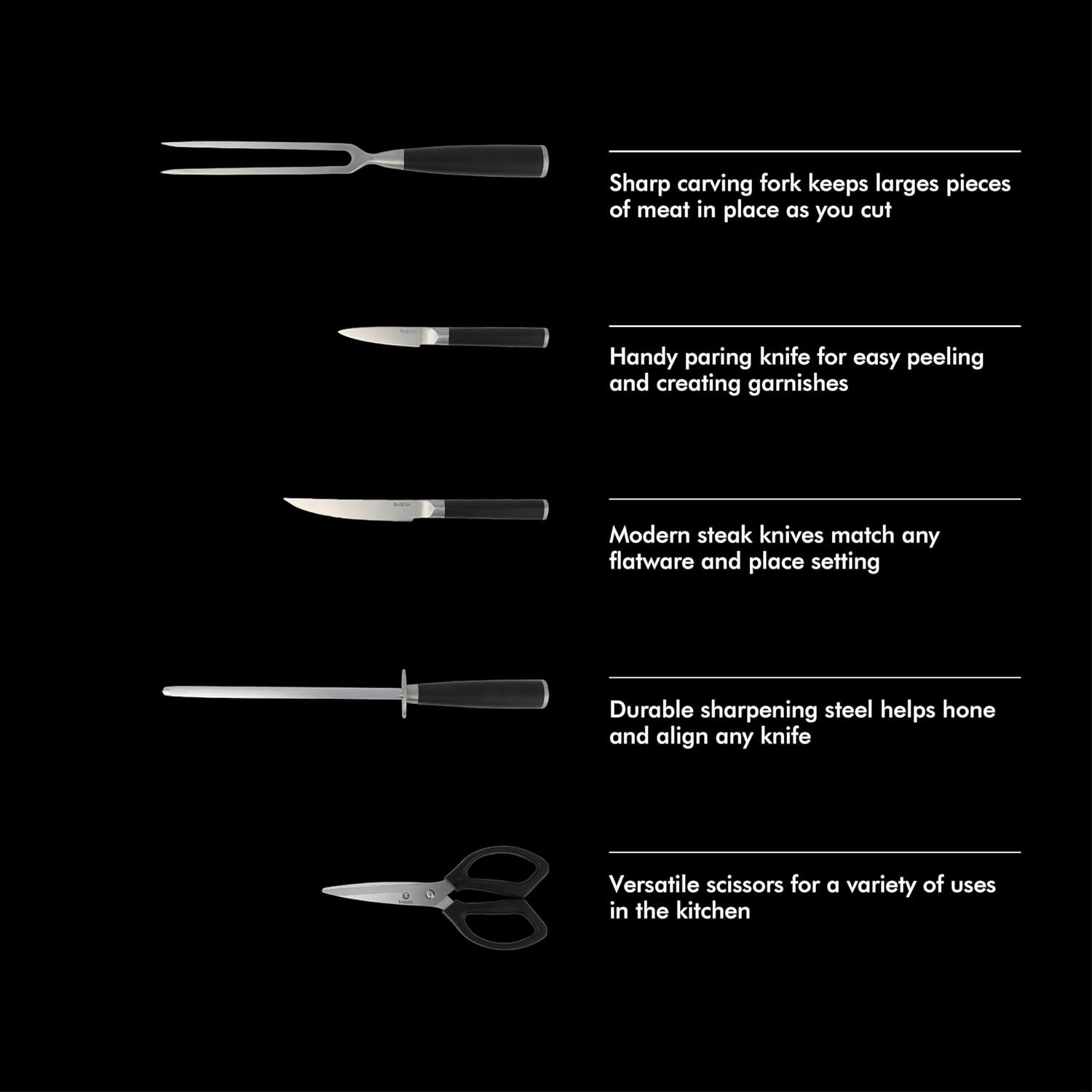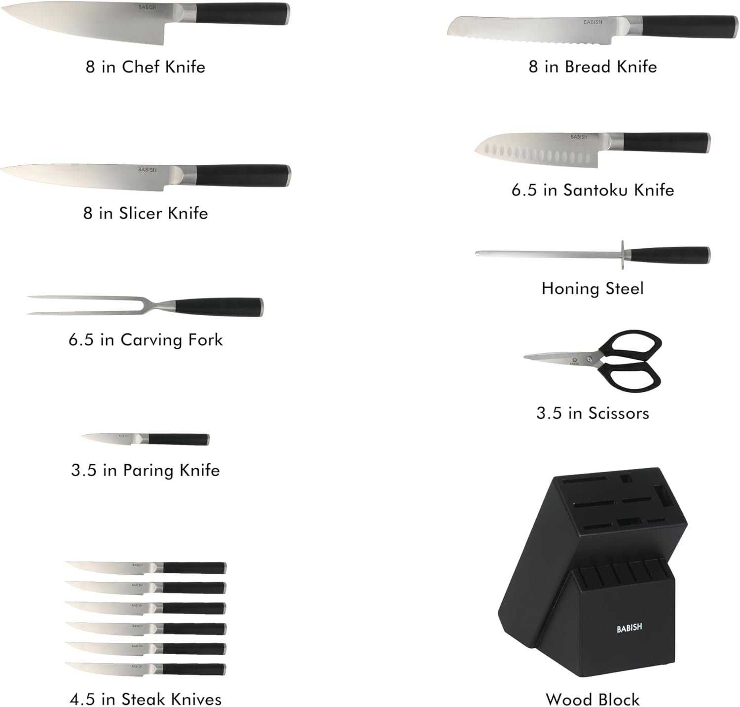 The set includes one 8-inch chef knife, one 8-inch bread knife, onne 8-inch slicer knife, one 6.5-inch carving fork, one 6.5-inch santoku knife, one 3.5-inch paring knife, six 4.5-inch steak knives, one pair of kitchen shears, one sharpening steel and one knife block