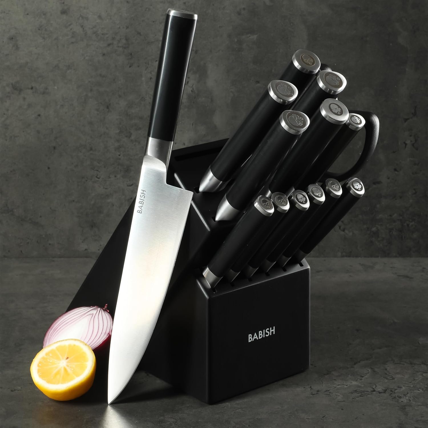 Babish High-Carbon 1.4116 German Steel 15 Piece Full Tang Forged Cutlery Kitchen Knife Block Set – Black