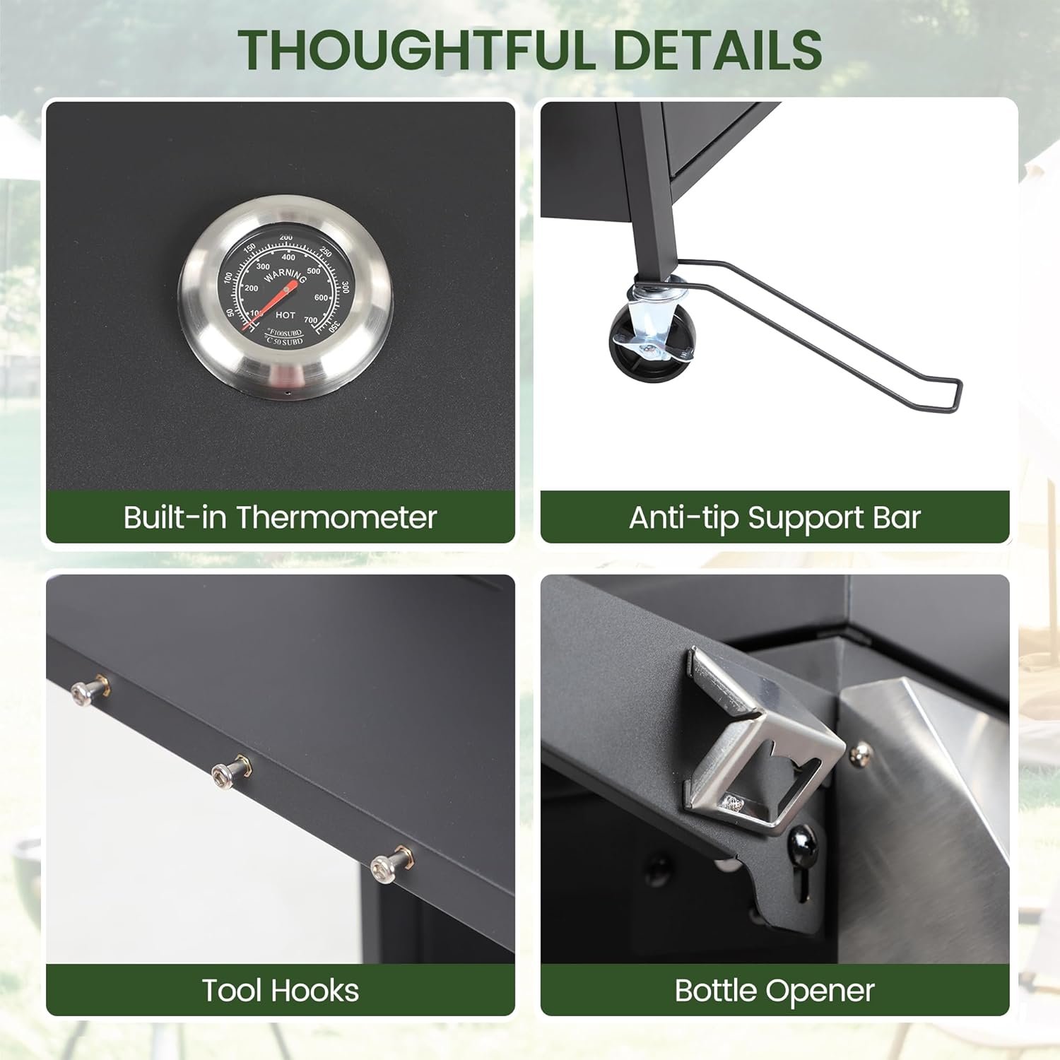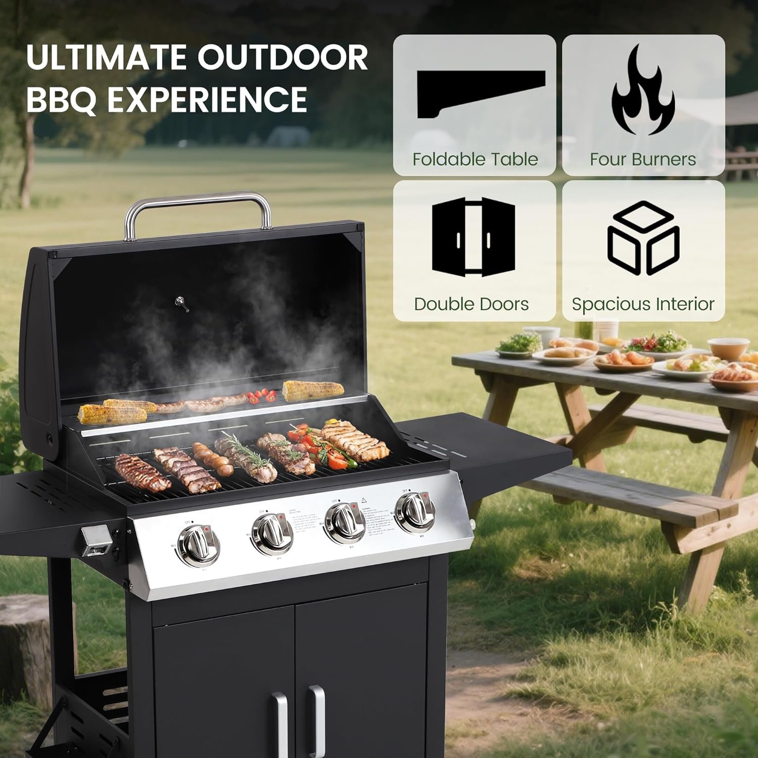 POWERFUL 40,000 BTU HEAT OUTPUT:Fire it up and feel the heat! With four 10,000 BTU stainless steel burners, this gas grill delivers quick ignition, even heat distribution, and consistent performance every time. The built-in precision thermometer lets you monitor temperature with ease—perfect for everything from high-heat searing to slow, juicy BBQ cooking