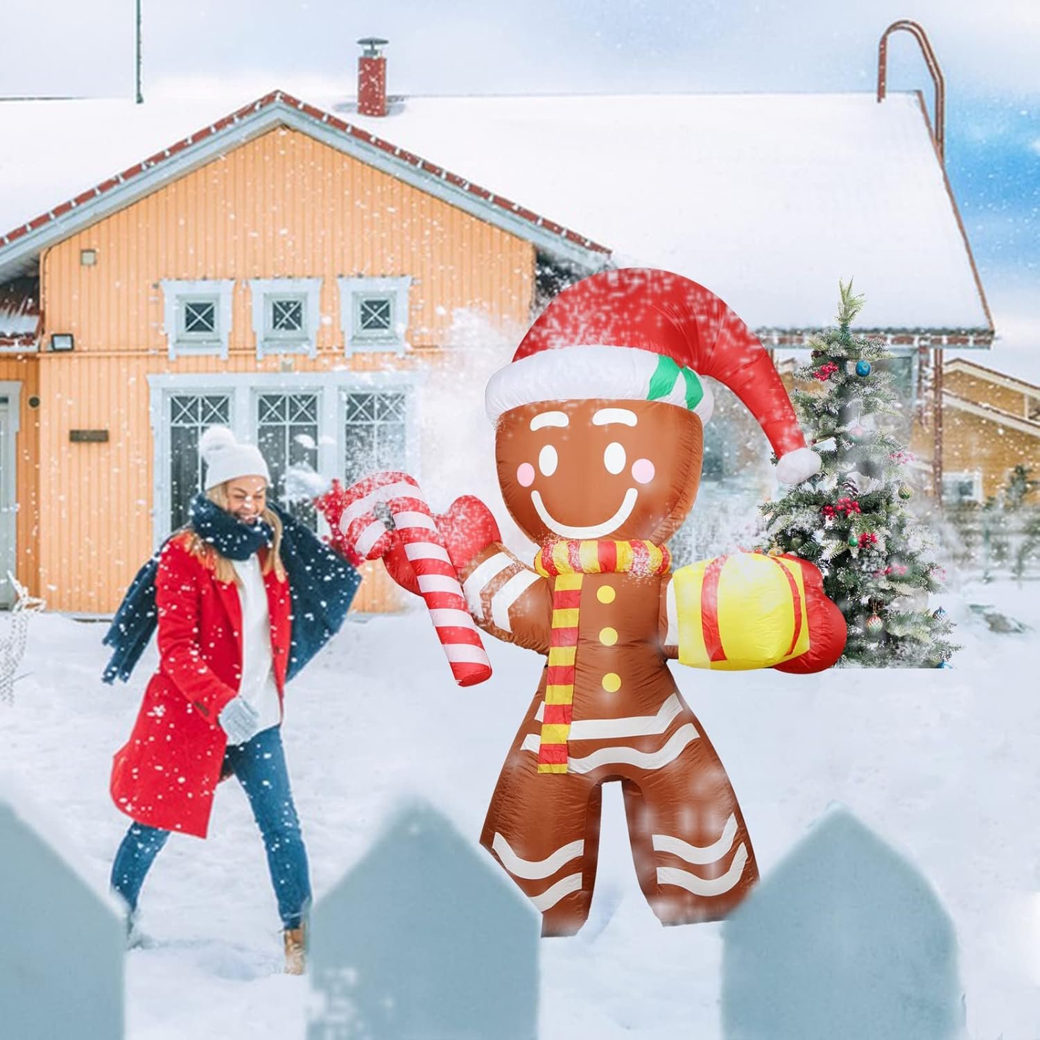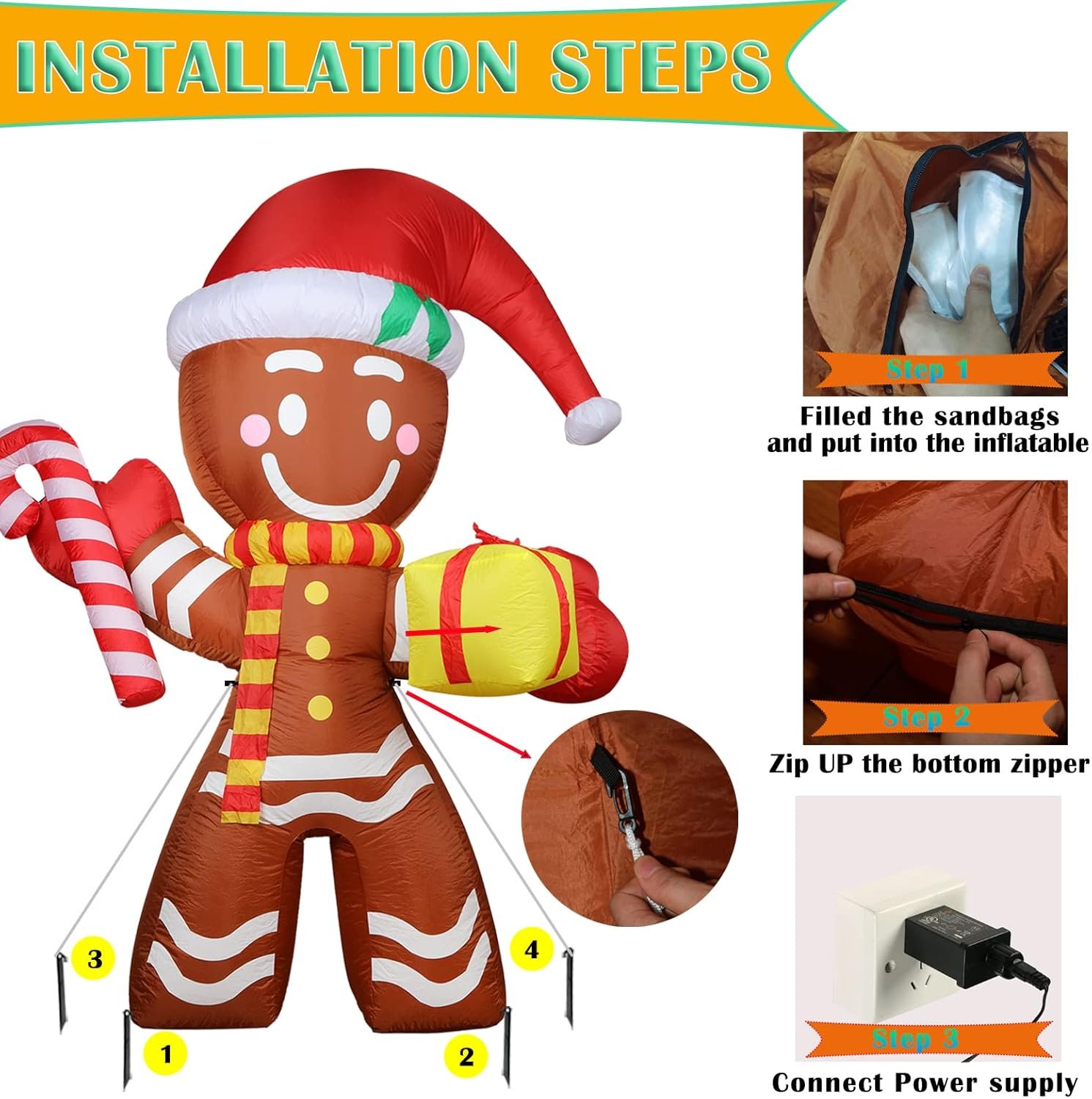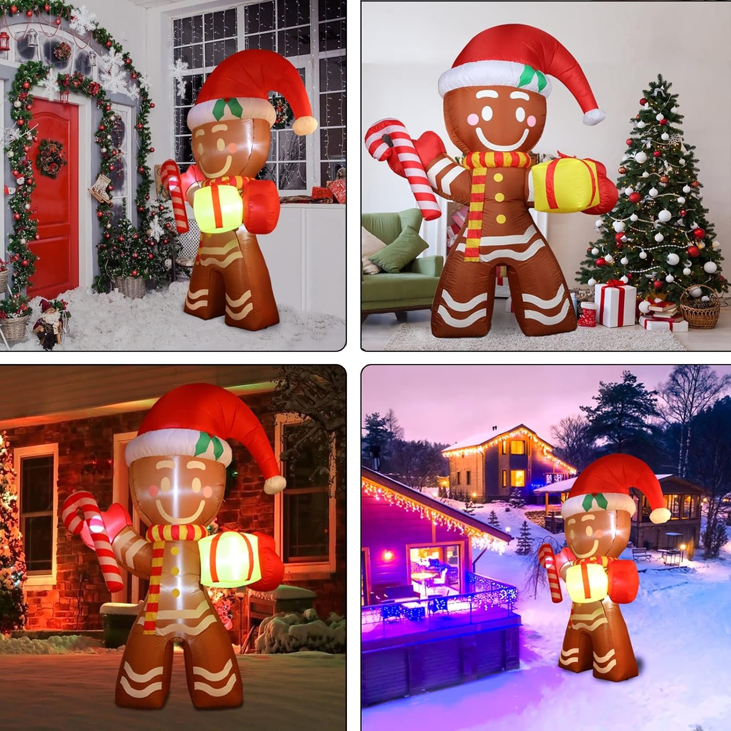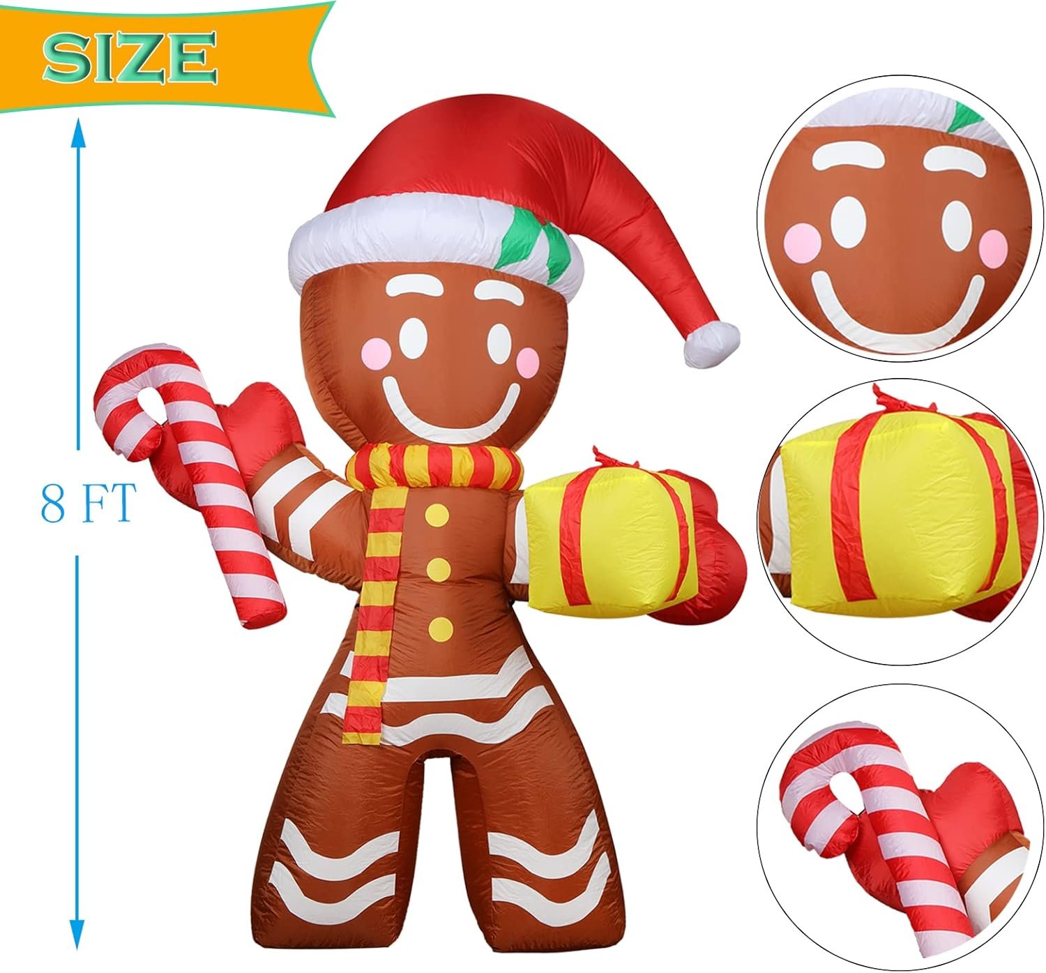 【8FT Gingerbread Man 】 — The Inflatable Gingerbread Man is reaches 8ft x 5.2ft .Great size for indoor, outdoor, party, stage prop, office, yard and more.It hold a candy and a Christmas gift box , bringing the greatest Christmas atmosphere.